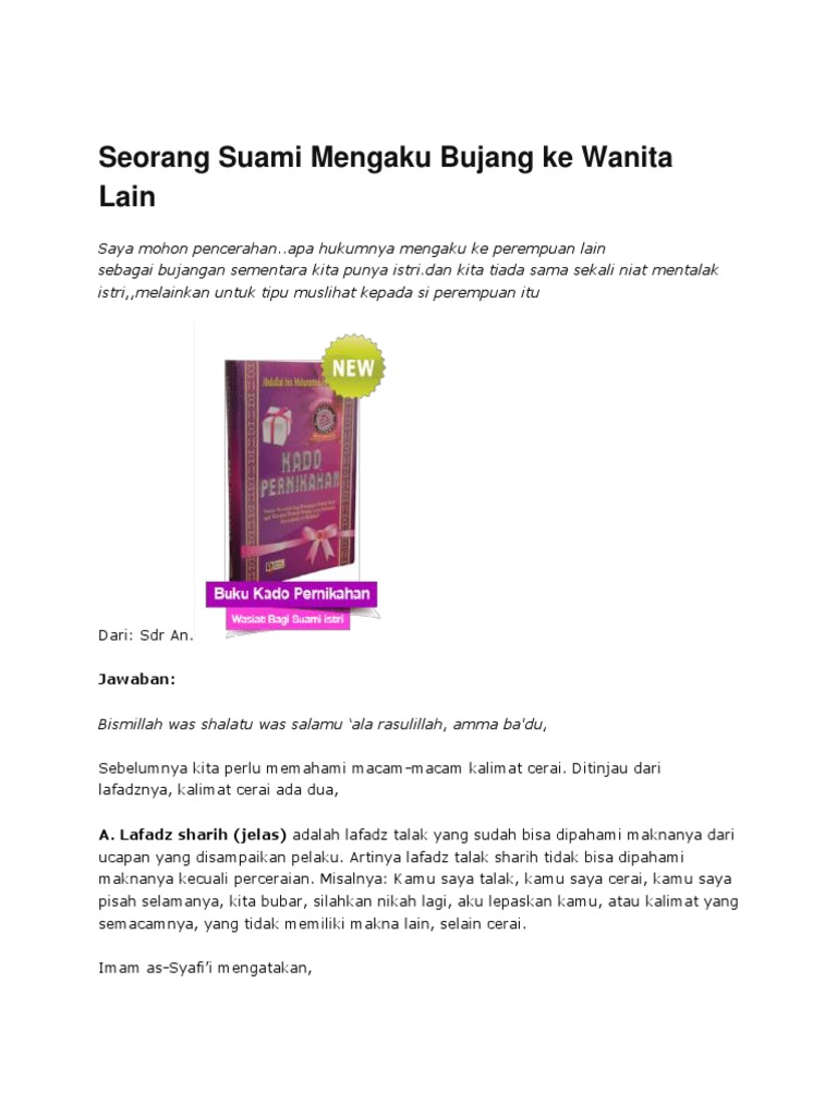 Ramai Suami Tak Sedar Dah Jatuhkan Cinta Suami Isteri Facebook from lookaside.fbsbx.com Berikut adalah penjelasan hukum yang diberikan dan telah diperakui oleh s.s. Apakah hukum seorang suami mengaku dirinya bujang? Apa statusnya bila seorang suami mengaku di depan orang bahawa dia duda dah 5 tahun.sedangkan dia masih seorang suami kepada seorang wanita. Adakah kamu sudah beristeri? lalu dijawabnya : Setiap perkataan yang menjurus kepada pensabitan talak tidak boleh dituturkan sewenangnya. Adakah pengakuan 'bujang' tersebut boleh membawa kepada hukum jatuhnya talak kepada pasangan? Akan tetapi, pendapat yang lebih kuat, semata qarinah (indikator) tidak bisa jadi landasan. Adakah jatuh talak jika suami mengaku bujang walaupun ianya sekadar gurauan?