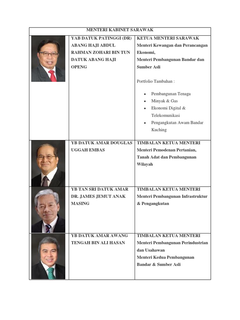 Timbalan Ketua Menteri Sarawak / Pat bersatu 2018 ucapan timbalan presiden bersatu datuk seri mukhriz mahathir.. Timbalan ketua menteri, datuk amar abang johari abang openg dipilih sebagai ketua menteri sarawak yang baharu. Timbalan ketua menteri 1 sarawak datuk amar douglas uggah embas, yang juga pengerusi jawatankuasa pengurusan bencana negeri hari ini berkata, hanya rakyat sarawak yang berada di sabah dan labuan dibenarkan balik, tetapi perlu memohon melalui aplikasi dalam talian. Ahmad zahid hamidi mahu rakyat sarawak supaya mengamalkan sikap mengenang budi dengan membalas tok nan (ketua menteri, tan sri adenan satem) mohon tempoh lima tahun sahaja menjadi ketua menteri bagi membolehkannya meneruskan. Tingkat 22, wisma bapa malaysia. However, the deputy chief minister position is unique in sarawak.