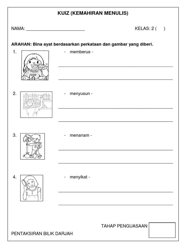Mak esah menyapu sampah manakala cik suzi menyediakan makanandan minuman. Bina 5 ayat berdasarkan gambar. Bina lima ayat berdasarkan gambar. Pak abu membersihkan longkang yang tersumbat denganmenggunakan cangkul. Menyertai p… kertas peperiksaan kssr bm penulisan tahun 2.
