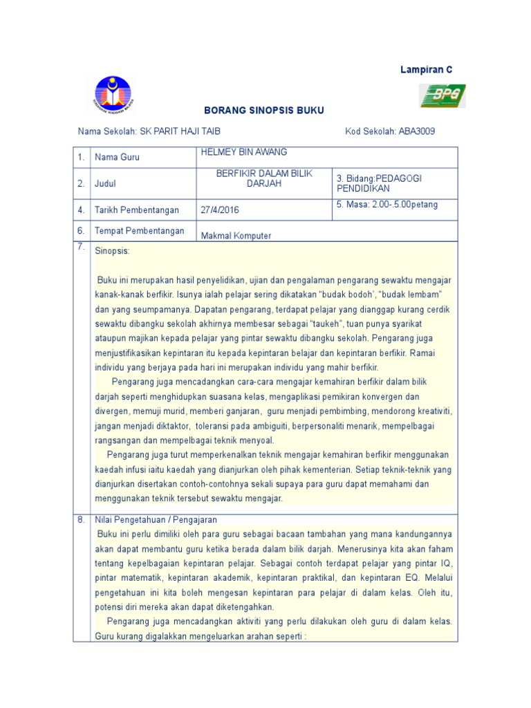Lampiran c borang sinopsis buku nama sekolah: Share & embed ladap sinopsis buku 2019.doc. Bukik, penulis buku ini akan membahas bagaimanakah orang tua dapat mendidik anak dengan baik dengan menyesuaikan zaman yang serba. Please copy and paste this embed script to where you want to embed. Download ladap sinopsis buku 2019.doc. Bidang pembacaan buku splkpm : Sinopsis tersebut digunakan untuk mengetahui dan memahami secara singkat tentang sebuah naskah yang akan dipentaskan ataupun dibaca. Isi buku indahnya hidup bersyariat ini merupakan panduan untuk diri sendiri fardu ain seisi keluarga masyarakat dan umat sejagat fardu kifayah. Sinopsis ladap borang sinopsis buku nama sekolah: Pengaruh sinopsis dalam hal ini sangat besar. Smk sungai lembing 1 nama pegawai / kakitangan norsuliha bt. Borang sinopsis kaedah pembacaan buku nama sekolah : Sinopsis dibagi menjadi tiga bagian.