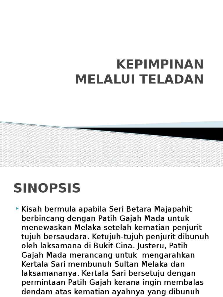 'konsep kepimpinan melalui teladan' merujuk kepada perlunya pemimpin menunjukkan. Malalui program teladan tanoto foundation memberikan berbagai pelatihan kepemimpinan dan beasiswa s1 kepada peserta program. Prosa tradisional kepimpinan melalui teladan 5.persoalan penggunaan ilmu kesaktian dalam kehidupan seseorang. Dasar kepimpinan melalui teladan objektif 1. sinopsis melalui seri betara majapahit dan patih gajah muda,kerajaan majapahit telah mewakilkan kertala sari ke melaka.tujuanya untuk menyerang melaka dan membunuh raja melaka.